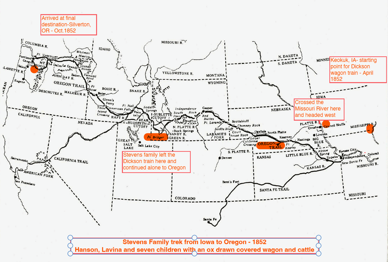 Details of their preparations and journey and history of the family and their descendants are contained in the Stevens Family History: Hanson and Lavina Stevens (2006). A copy can be found at the Oregon Genealogy Society.