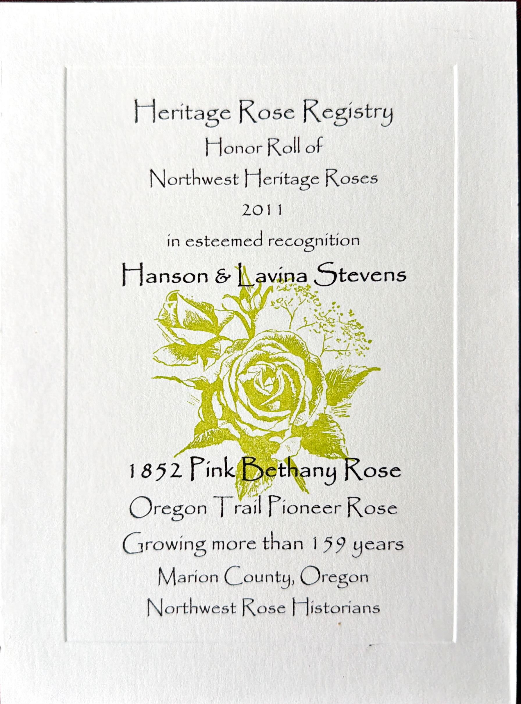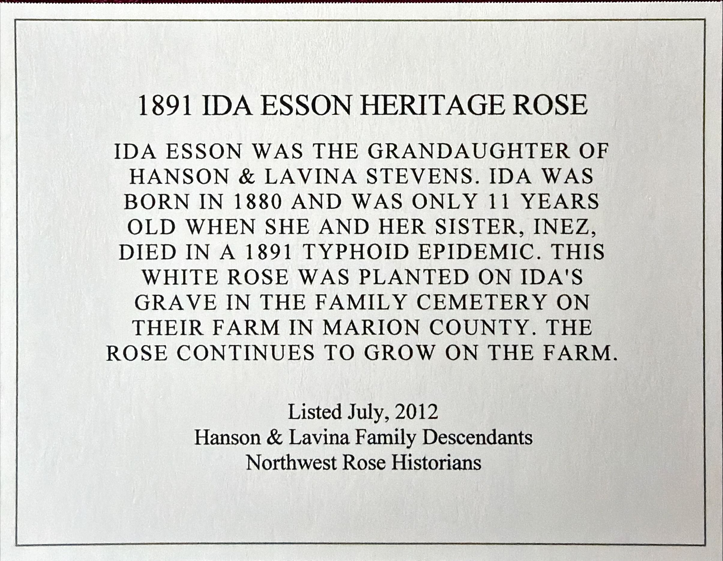 Our family is honored that the 1852 Bethany Rose and Ida Esson Rose are now listed as Heritage Roses on the Northwest Heritage Rose Registry and planted adjacent to the entrance at the Antique Powerland Museum complex in the Pioneer Rose Collection of the French Prairie Heritage Rose Garden in Brooks, Oregon.